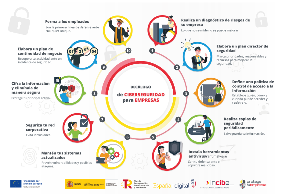 Descarga y ten siempre a mano el "Decálogo de ciberseguridad para empresas" del INCIBE, que contiene diez pasos imprescindibles a tener en cuenta para ser una empresa cibersegura, promover la confianza entre tus clientes y ser un negocio competitivo.