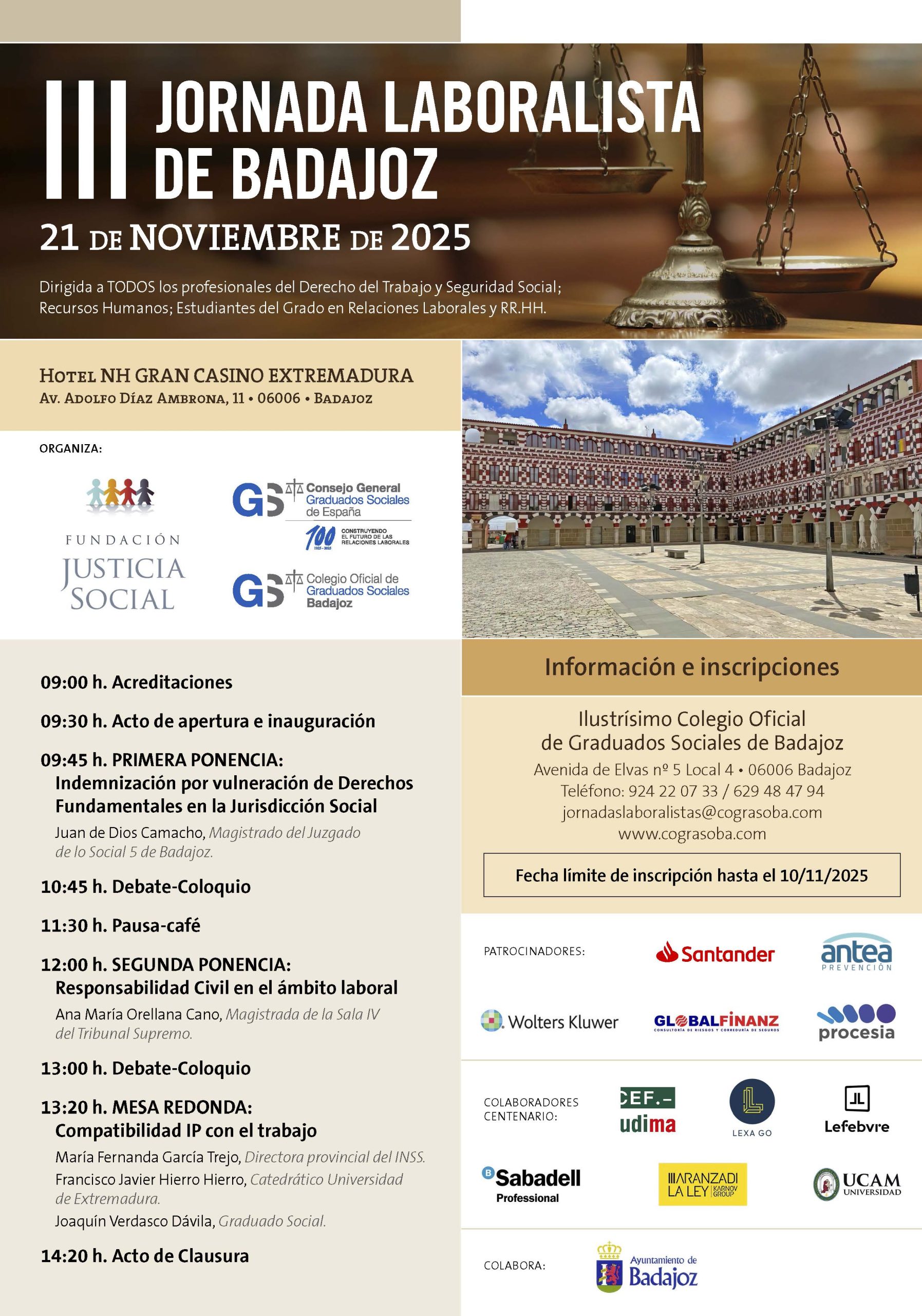 En esta ocasión, nos complace anunciarte la III Edición de las Jornadas Laboralistas, que se celebrará el próximo 21 de noviembre. Con el fin de facilitar la asistencia de todos los compañeros, especialmente aquellos que deben desplazarse, hemos optado por concentrar el programa en una sola jornada, garantizando así una experiencia formativa y de convivencia más cómoda y productiva.