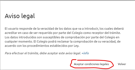 Aviso legal: El usuario responde de la veracidad de los datos que va a introducir, los cuales deberá acreditar en caso de ser requerido por parte del Colegio como receptor del trámite. Los datos son susceptibles de comprobación por parte del Colegio en cualquier momento. El Colegio podrá reclamar la comprobación de su veracidad, de acuerdo con los procedimientos establecidos por Ley.